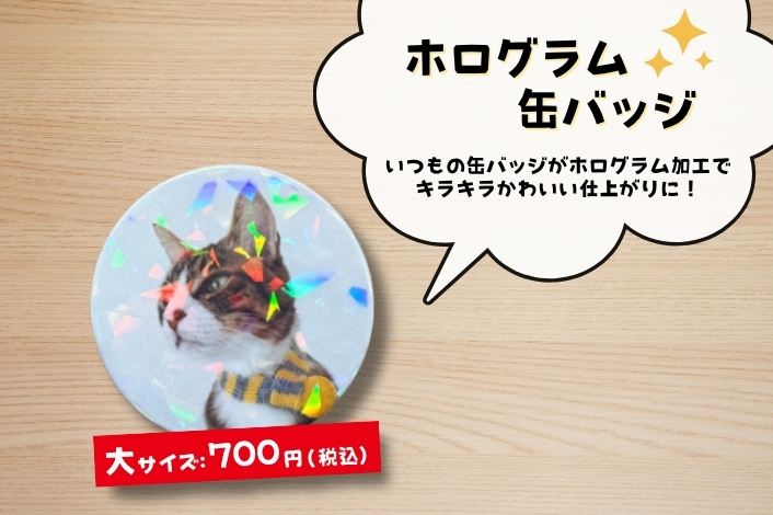 通常の「缶バッジ」の価格に、ホログラム加工料としてプラス100円(税込)で作れます。