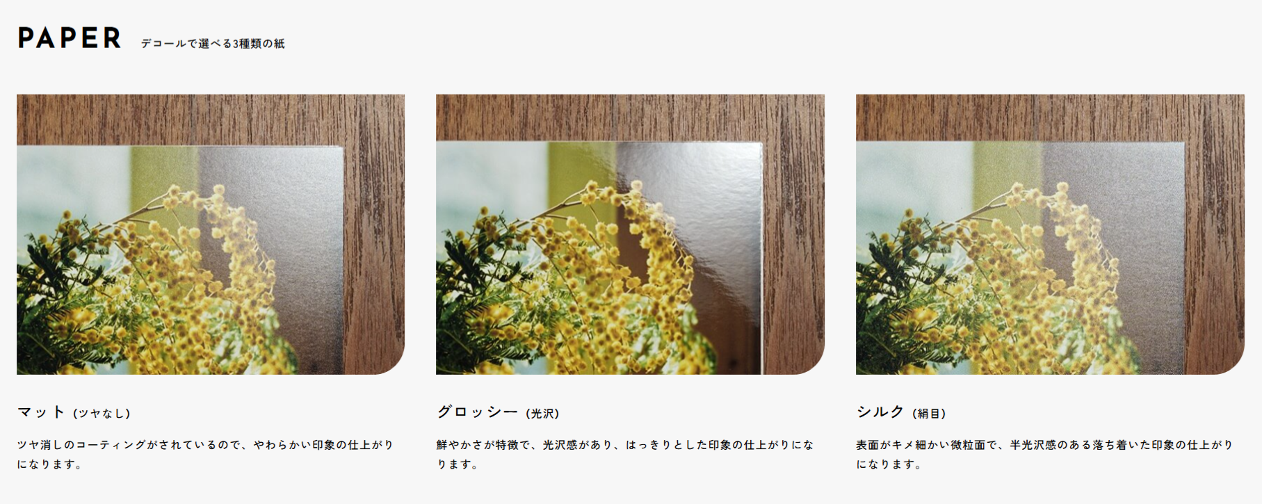 | ペーパー | マット(ツヤなし) グロッシー(光沢) シルク(絹目)※宅配受取限定 |
