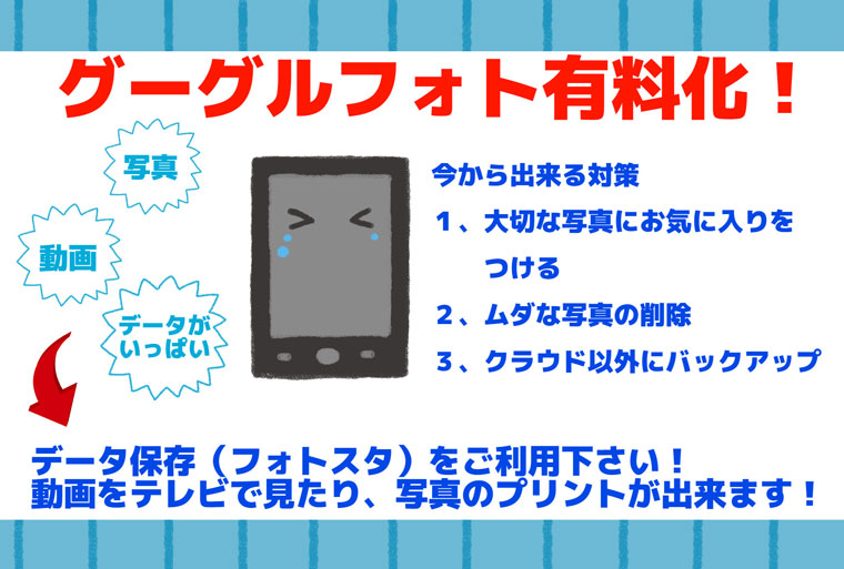 スマホの写真整理、グーグルフォト無制限終了に伴いデータのバックアップをしておきたい、おじいちゃんおばあちゃんにお孫さんの動画を送りたい、そんなお客様へおすすめです。