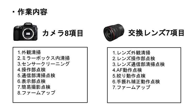 センサーのクリーニングもしっかり行います。レンズに関しては、AFの作動点検・絞り動作点検、手振れ補正の作動点検も行います。
