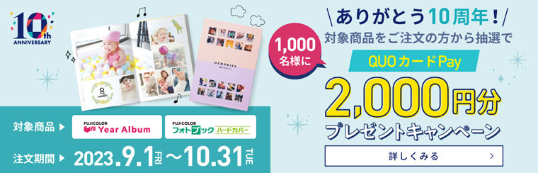 10周年の感謝を込めて「イヤーアルバム」と「フォトブック ハードカバー」をご注文のお客様から、抽選で1,000名様に2,000円分のQUOカードPayをプレゼントします!