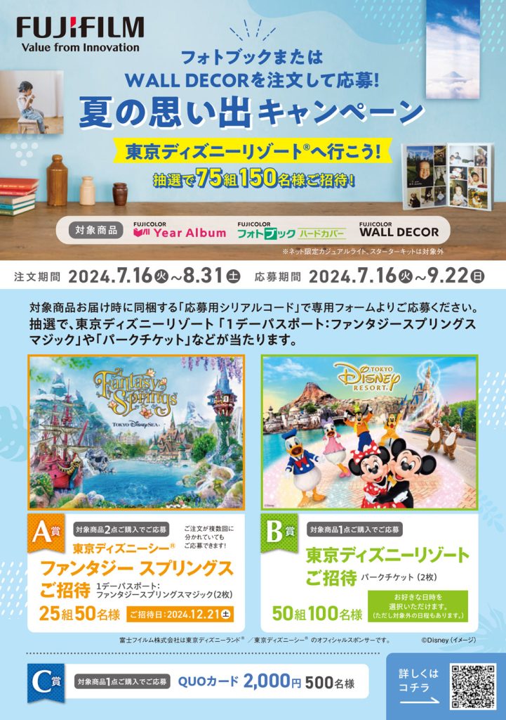 対象商品(イヤーアルバム・フォトブック ハードカバー・ウォールデコー)をご注文のお客様に、抽選で東京ディズニーリゾート®️「1デーパスポート:ファンタジースプリングスマジック」や「パークチケット」、またはQUOカードをプレゼント。