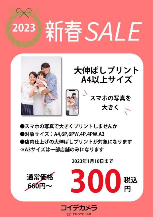 大伸ばしプリントのA4サイズ以上(通常価格660円~)がなんと1枚300円でプリントできます。