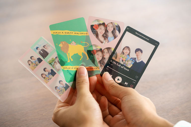 トレカ、カレンダー、写真パネルを1個から作成可能な写真をカタチにするサービスです。