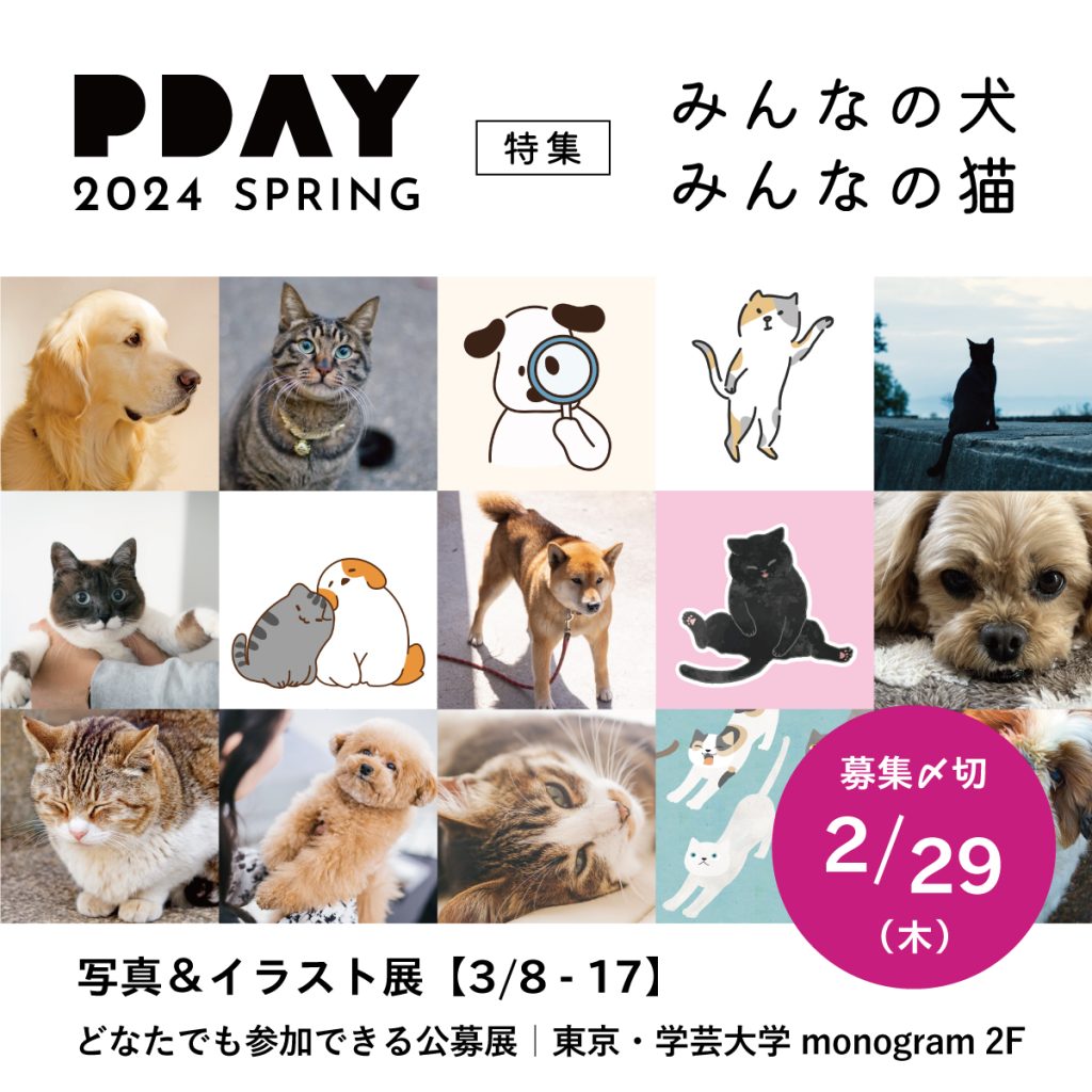 2024年春は、PDAY 2024 SPRING【特集】みんなの犬 みんなの猫にちなみ、「犬」と「猫」限定の作品を募集・販売いたします。愛犬や愛猫の写真はもちろん、イラストとして描かれた犬や猫たちをモチーフにしたPDAY作品も大歓迎!出品料0円で販売いただけます。