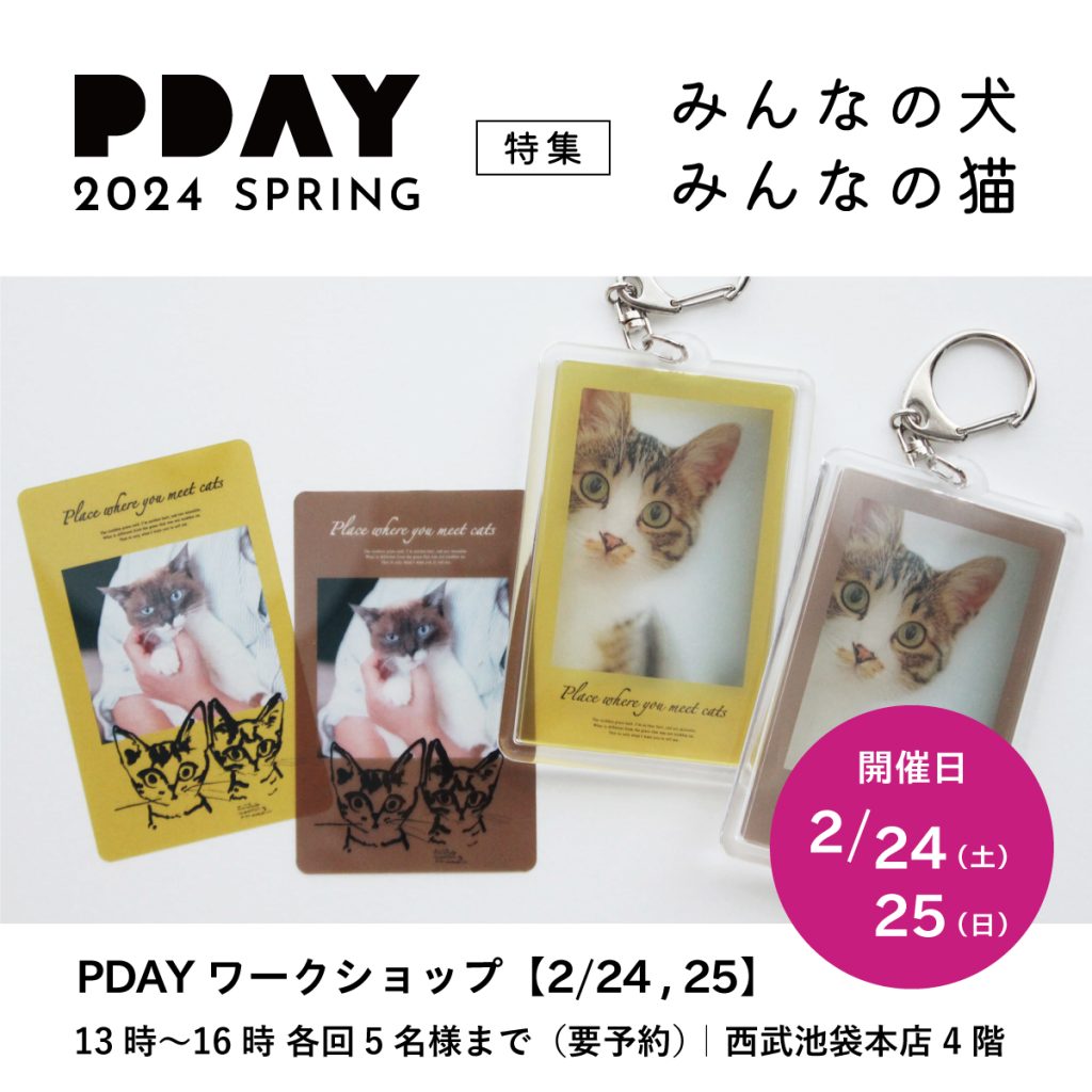 猫の写真でつくるPDAYトレカのワークショップや一般の方から自由に参加いただける犬と猫の写真&イラスト展、また、自分でつくったオリジナルのPDAYを販売できる「PDAY SHOP」は犬と猫の限定作品を募集し、どなたでも購入いただくことができます。