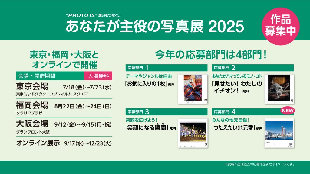 「お気に入りの1枚」部門、「見せたい!わたしのイチオシ!」部門、「笑顔になる瞬間」部門、「つたえたい地元愛」部門にご応募いただいた作品の中から著名人やプロ写真家10名が、それぞれ10作品、計100作品をセレクトし、会場にて発表します。選出作品は、東京・大阪・福岡の3会場で展示されます。