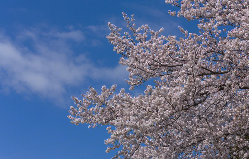 作例のように、空と一緒に桜を撮影すると、どうしても桜の花の色が暗くくすんでしまいます。