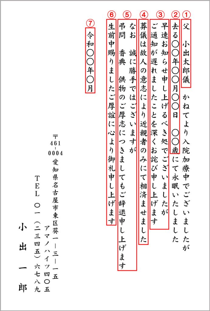 死亡理由については特に記載する必要はありません。 - 連絡が遅くなったことのお詫び