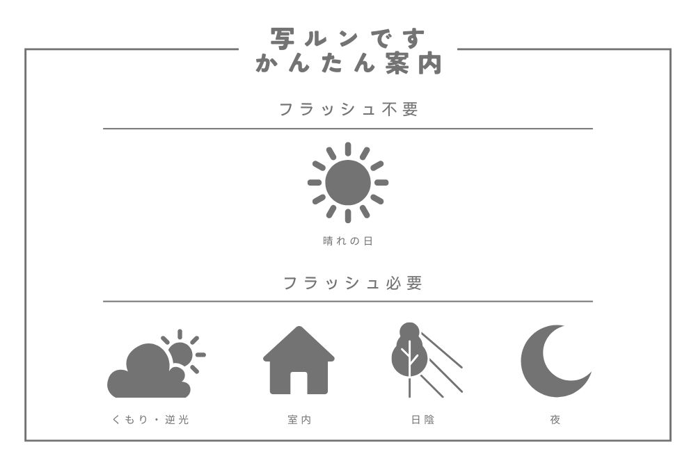 明るい屋外メインか、夕方や室内も撮るかでフラッシュの使いどころも変わります。