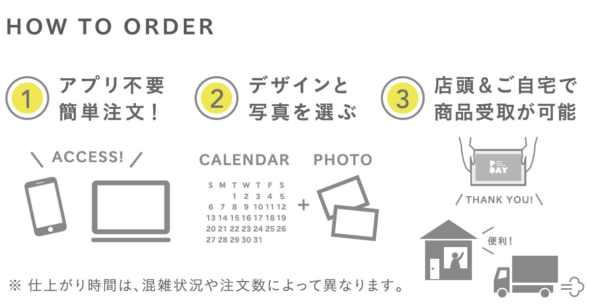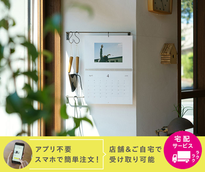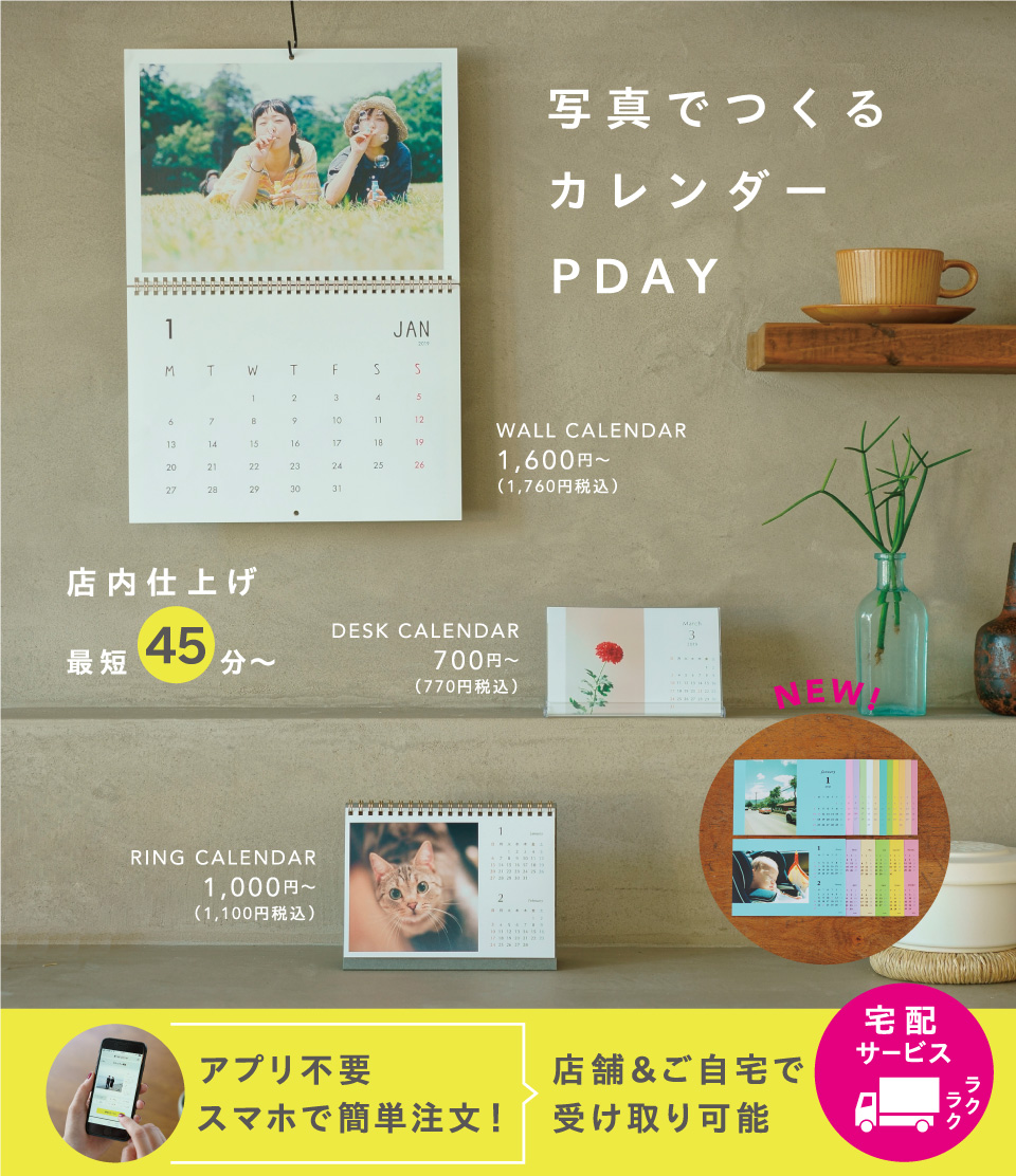 PDAYは、卓上、壁掛けのカレンダーが作成できるサービスです。スマホやパソコンから簡単に注文でき、店頭受け取りなら当日(最短30分〜)仕上がります。全国配送も可能です。