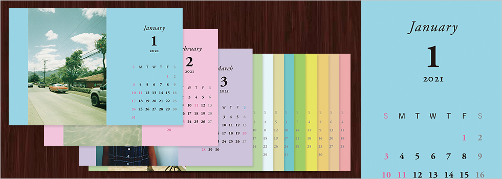 2021年のカレンダーから新しく「カラー」デザインが追加になりました!各月ごとに異なるカラフルな背景色がテーブルや机を華やかに彩ってくれます。