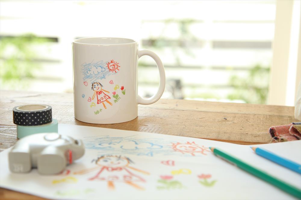 子どもが描いたイラストを使って、世界にひとつだけのオリジナルマグカップや缶バッジをつくることができます。