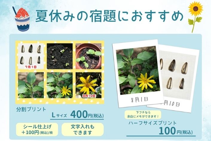 ネットからもスマホ写真が簡単に注文出来ますので、お子さまの夏休みの自由研究や宿題に使う写真はコイデカメラにお任せください!