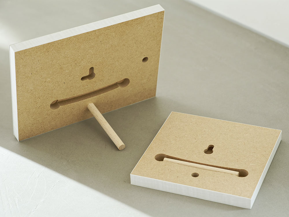 パネルの裏面には、フック、釘などをひっかけるための穴と細長いくぼみ部分に収納できるスタンド棒が付属しています。