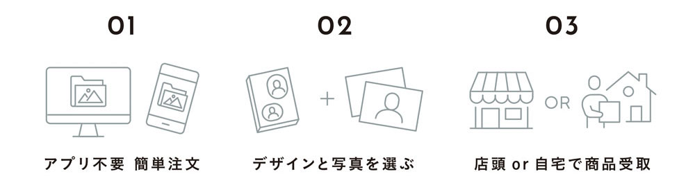 手持ちのスマートフォンやパソコンに保存された写真データを、ウェブサイトから簡単にアップロードできます。特別なアプリやソフト、会員登録など面等な手続きは必要ありません。24時間365日、お好きな時間に、ご自宅や外出先からでも手軽に注文できます。忙しいあなたにもぴったりです。