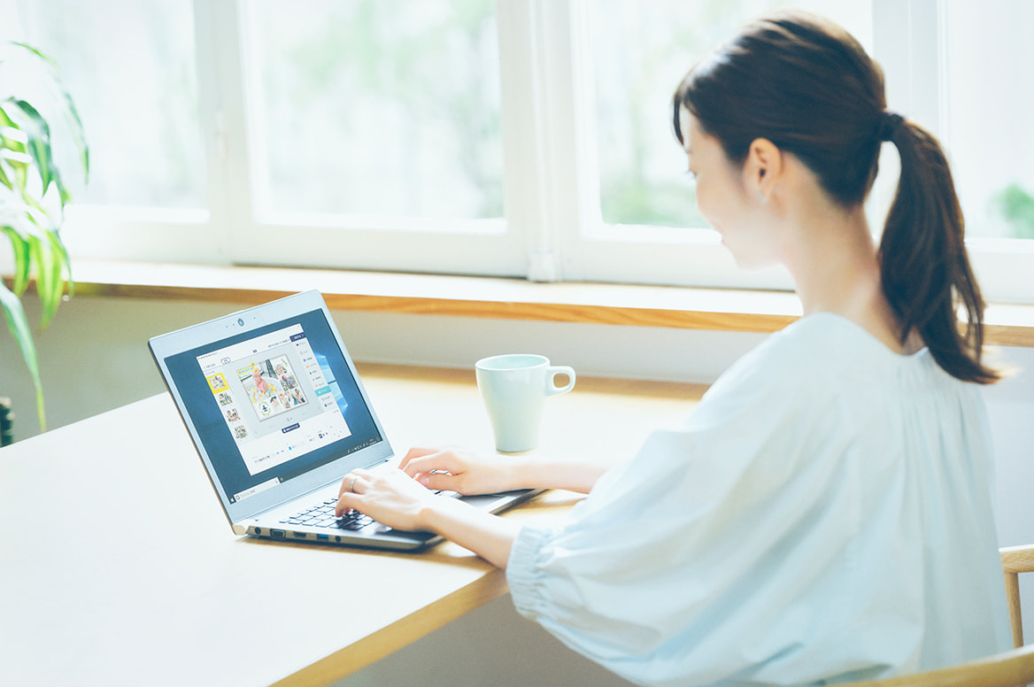 一冊のフォトブックをスマホ、パソコンから編集することができます。パパは朝の通勤電車にパパのスマホだけに入っている写真を追加して編集して保存。ママが子育ての合間に、編集途中のフォトブックに文字入れやスタンプを入れて、子どもが寝た後にパソコンで完成させるなど、場所、時間問わず、柔軟に作成することが可能です。