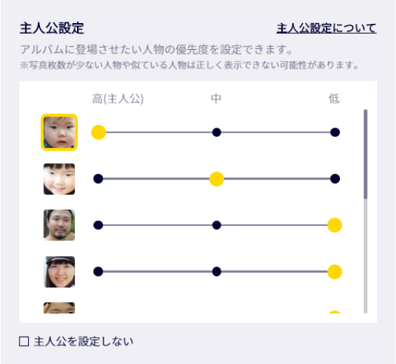 アルバムに優先して入れたい人物を設定すると、その人物を中心に自動で写真をセレクト&レイアウト。家族一人ひとりのフォトブックが簡単につくれます。また、祖父母へプレゼントをする際、孫と祖父母をメインにしたフォトブックも、手軽につくれます。