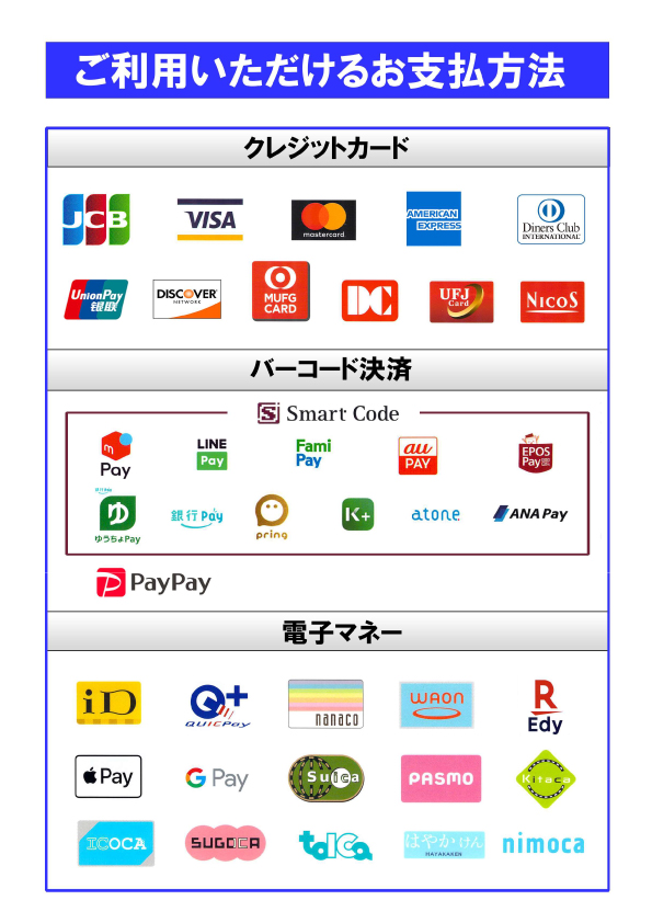 店舗でのお支払いでは、各種キャッシュレス決済(クレジットカード、Suica、PayPay等)がご利用いただけます。