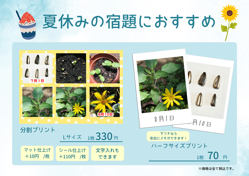 コイデカメラは夏休みの自由研究・宿題を頑張るお子様を応援します!自由研究や課題にピッタリな写真プリントを使った宿題をお子様と一緒に作ってみませんか?ご注文は、お店注文だけではなく、便利なネットプリントのご注文も承っております。
