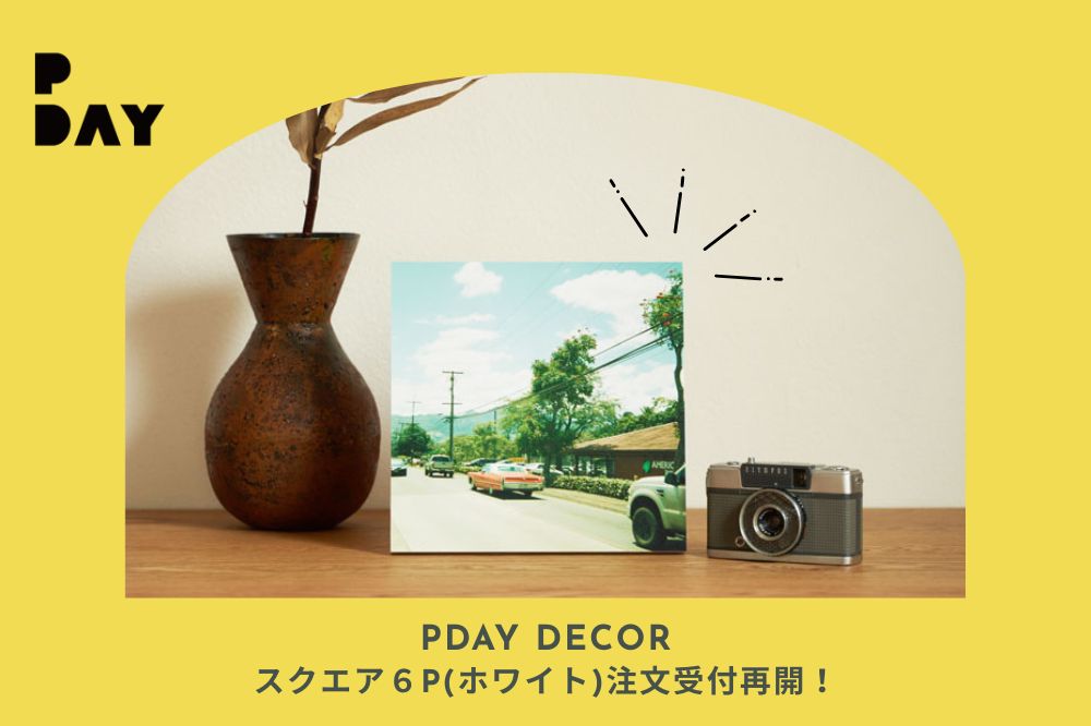 コイデカメラの大人気商品「PDAY DECOR スクエア6Pサイズ(ホワイト)」が受注再開!家族写真やお気に入りの一枚を飾ろう。注文は写真を選ぶだけ。リビングや子ども部屋のインテリアにぴったりです。