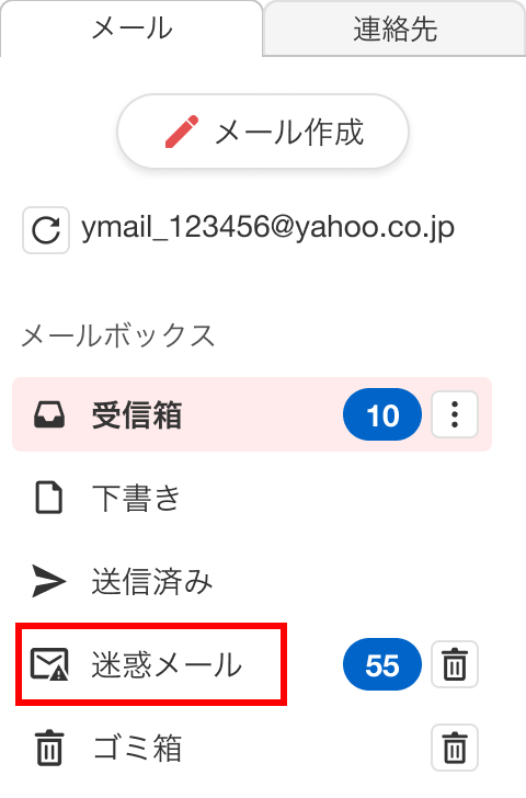 [迷惑メール]フォルダに探しているメールがないか確認してください。