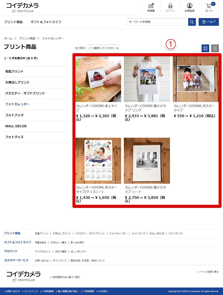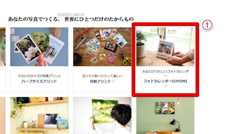 コイデカメラ ネットプリントサービス > を開き、カーソル(矢印)を①「フォトカレンダーCOYOMI」に移動し、「注文に進む」をクリック。
