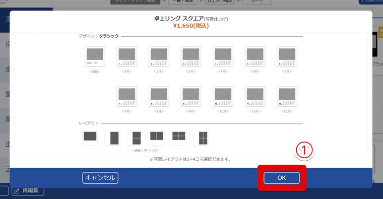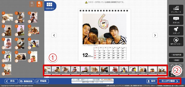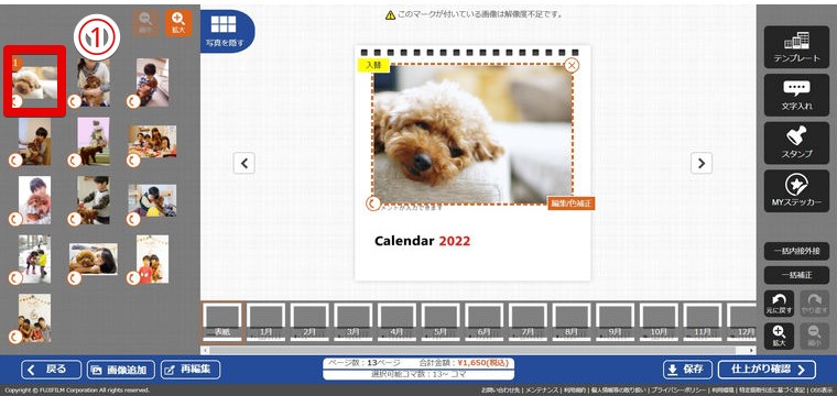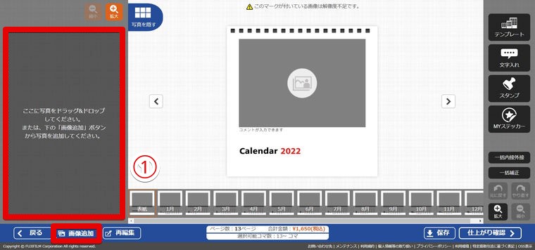 上記の「8.表紙画像を選択」と同様、①各月のページに画像を追加。
