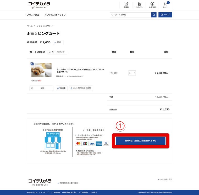 店舗受取の場合、①から「写真専門店受取/支払」を選択。