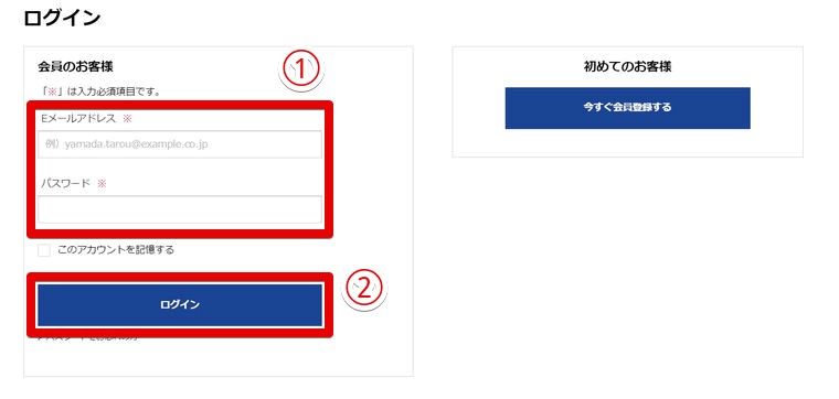 ①会員登録した「Eメールアドレス」と「パスワード」を入力。