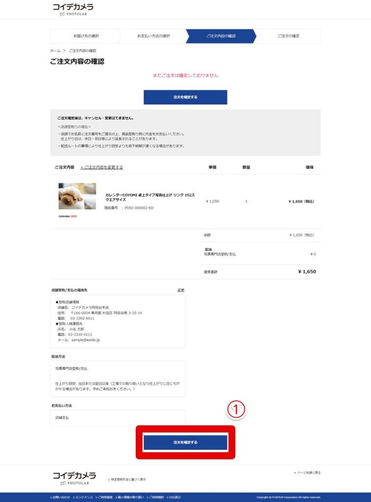 ご注文内容を確認し、①「注文を確定する」をクリック。