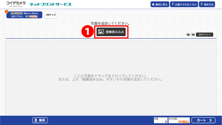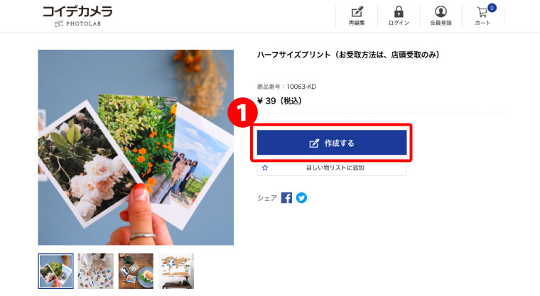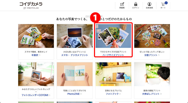 ❶コイデカメラ ネットプリントサイトを開き、ハーフサイズプリントを開く。