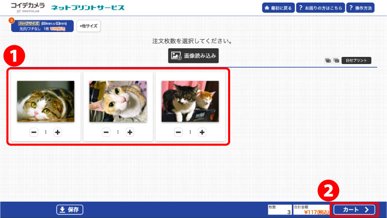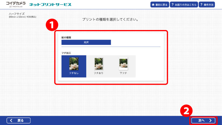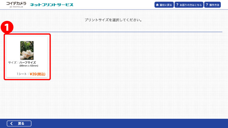 ❶プリントサイズ:ハーフサイズを選択してください。