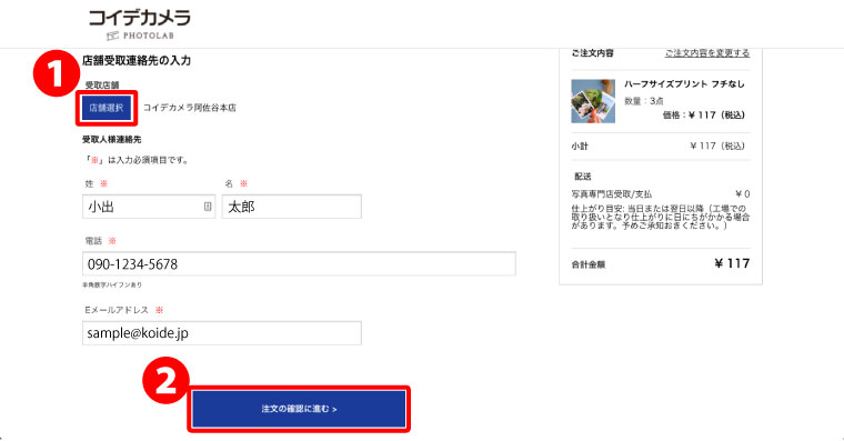 初めてのお客様は、❶「受取店舗」をクリックし、写真をお受け取りになる店舗を選択してください。