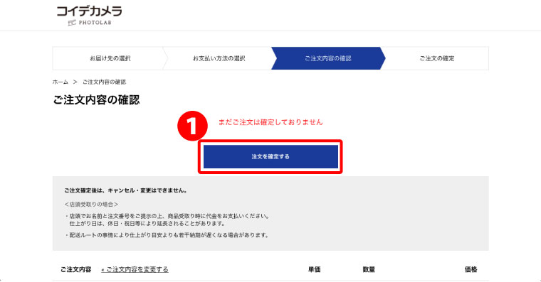 ご注文の内容に問題なければ、❶「注文を確定する」をクリック。