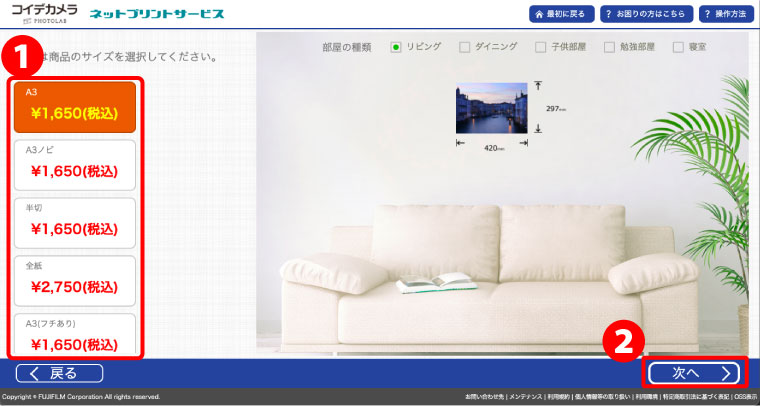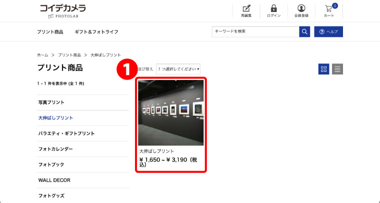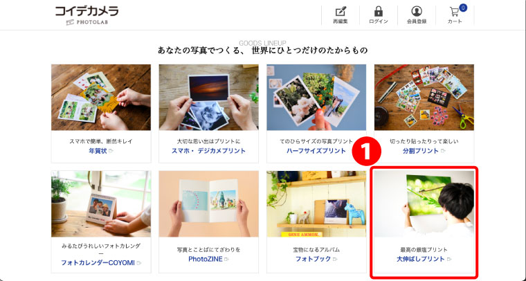 ❶コイデカメラ ネットプリントサイトを開き、大伸ばしプリントを開く。