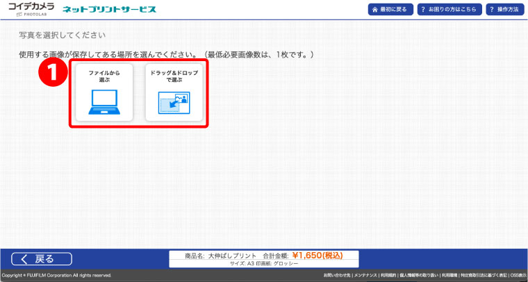 ❶「ファイルから選ぶ」か、「ドラッグ&ドロップで選ぶ」を選択。