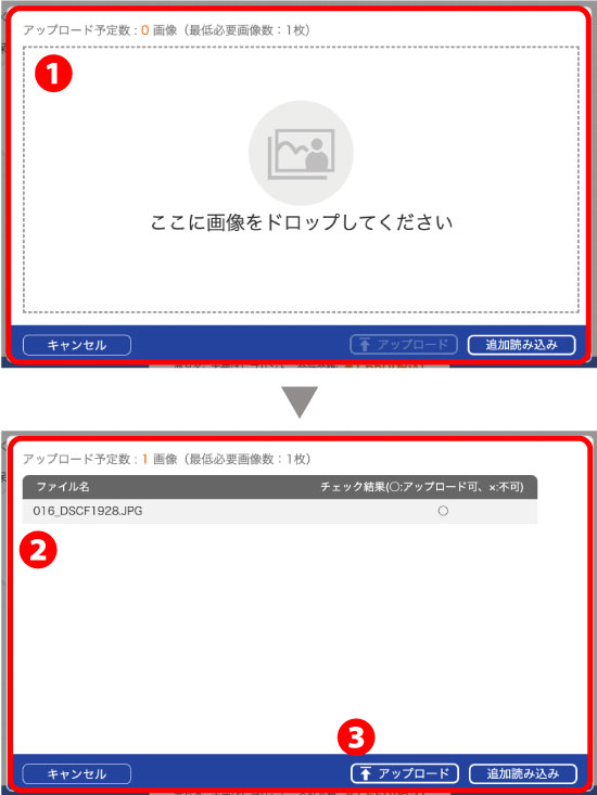 ❸問題なければ、「アップロード」をクリックする。