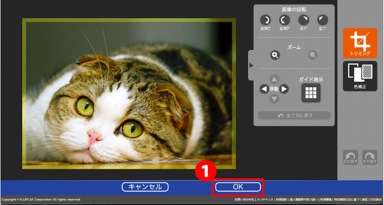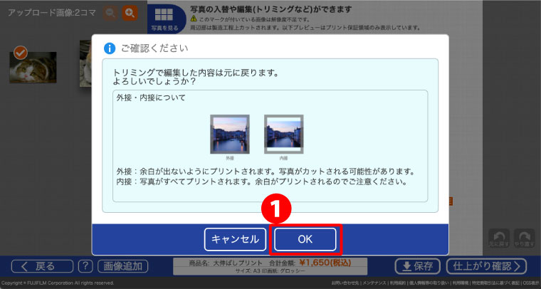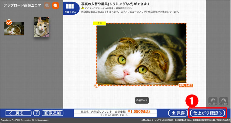 画像をクリック、入れ替えボタンなどで、プリントする画像を選択、❶「仕上がり確認」をクリックする。