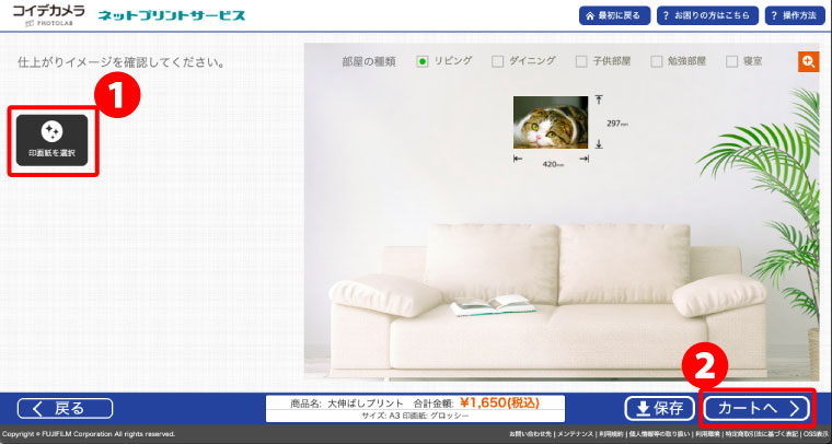 仕上がりイメージを確認後、❷「カートへ」をクリック。