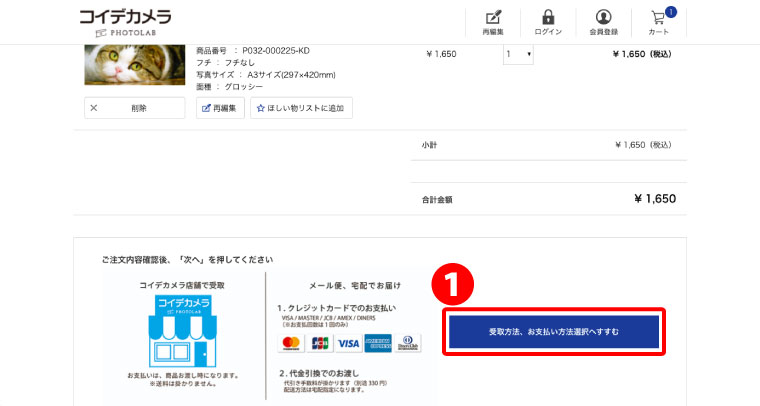 カートの内容を確認後、❶「受け取り方法、お支払い方法選択へすすむ」をクリック。