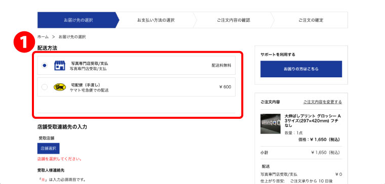 ❶「店舗での受け取り」か、「宅急便(ご自宅への配送)」をお選びください。