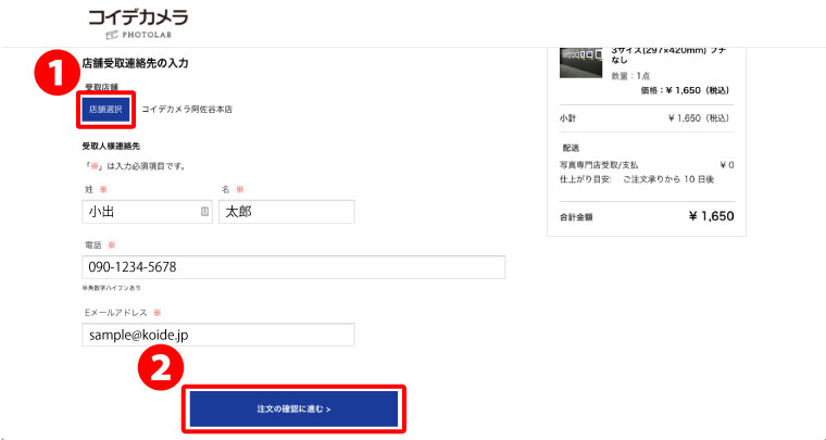 ❶「受取店舗」をクリックし、写真をお受け取りになる店舗を選択してください。