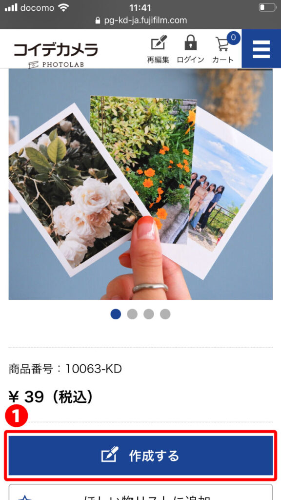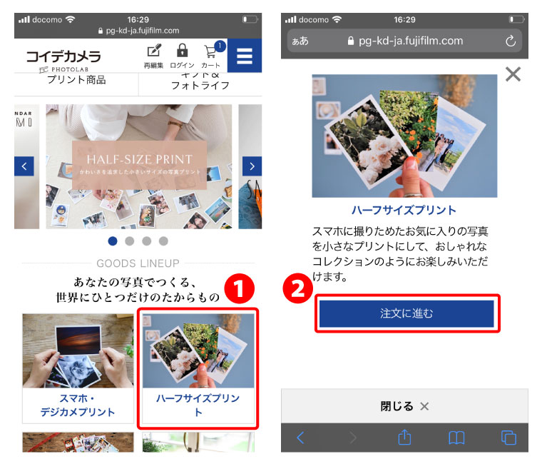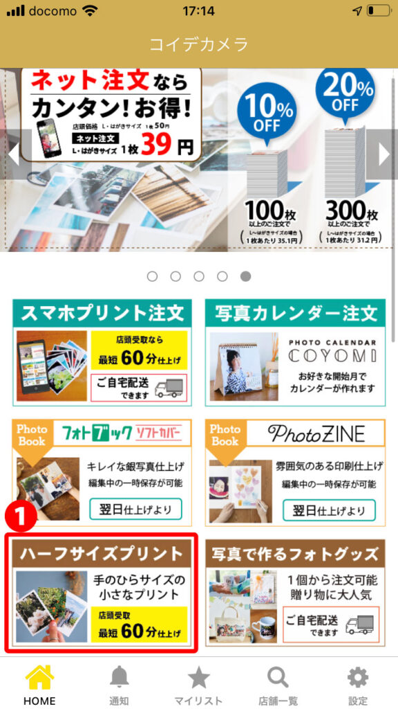 コイデカメラ ネットプリントサイト > を開き、「ハーフサイズプリント」をタップ。