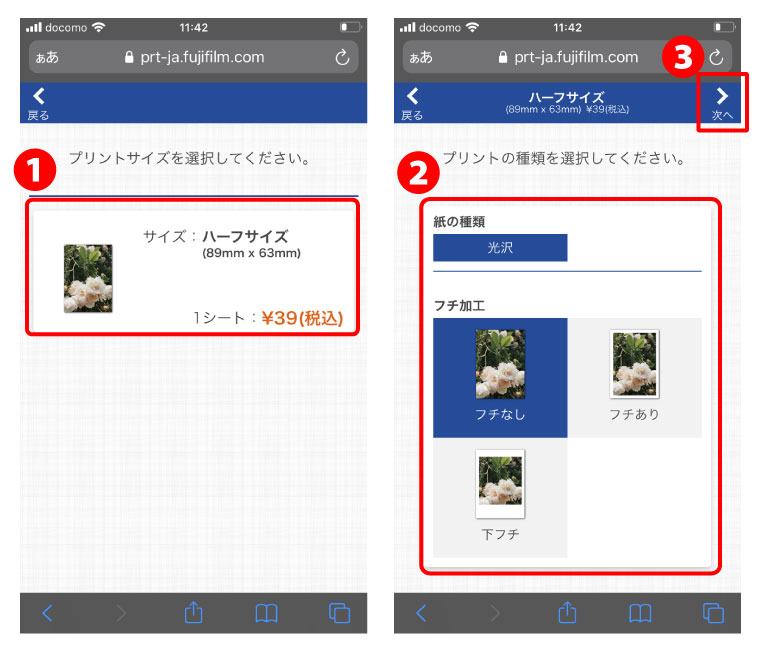印画紙の種類、フチあり、フチなし、下フチをタップし、次へをタップ。