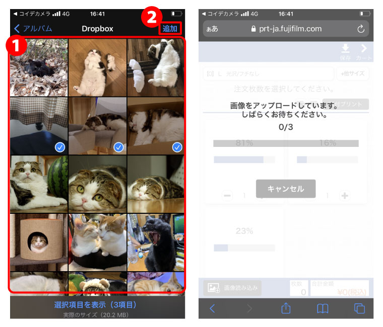 プリントしたい全ての画像をタップし、「追加」をタップする。
