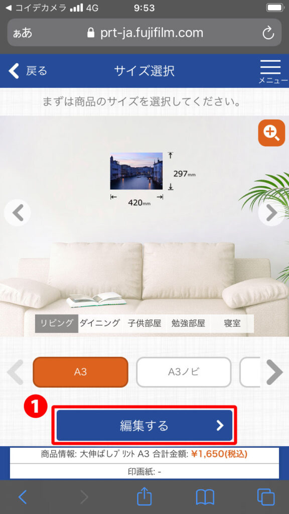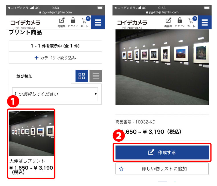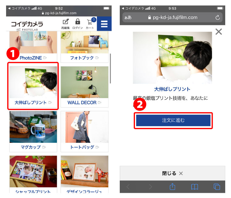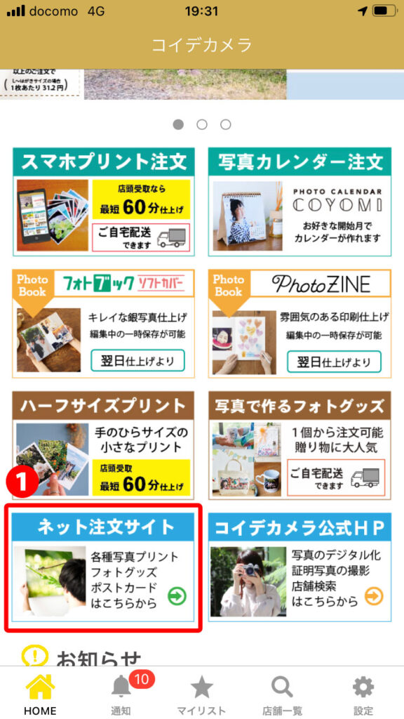 ホームページからの場合は、コイデカメラ ネットプリントサイト >を開きます。