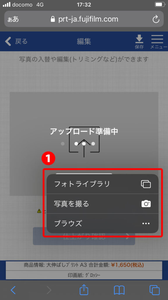 ❶iPhoneに保存されている画像の場合は、「フォトライブラリ」をタップする。