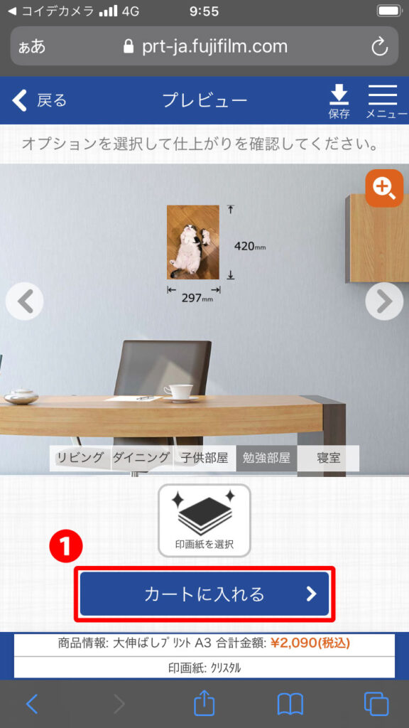 印画紙の種類を「グロッシー」、「クリスタル」、「ラスター」から選択できます。