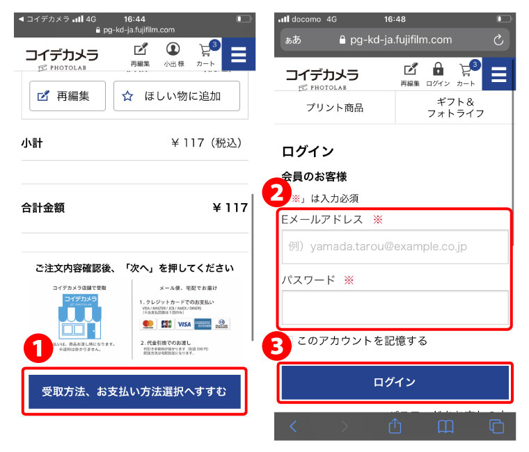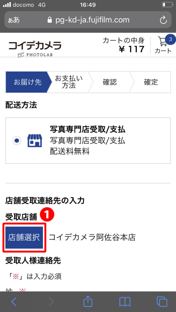カートの内容を確認して、❶「受取方法、お支払い方法選択へすすむ」ボタンをタップ。